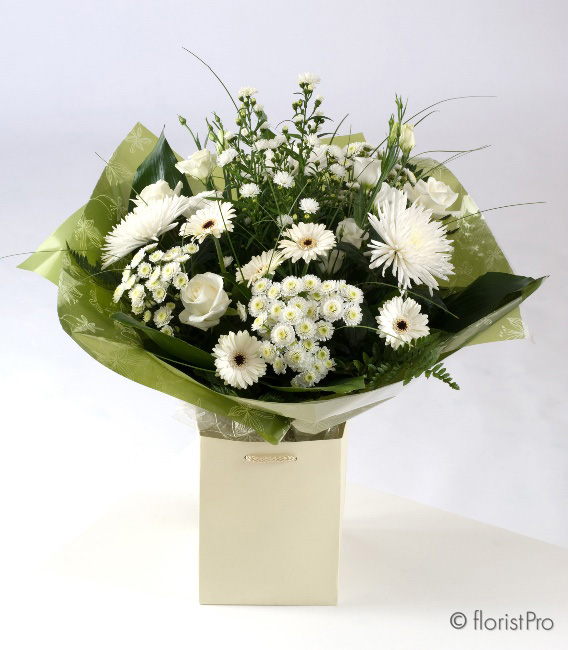 "Pure" embodies simplicity and elegance with its hand-tied bouquet featuring seasonal white and green flowers and foliage.