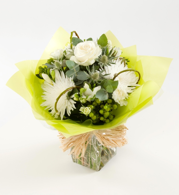 Our classic hand-tied bouquet features a beautiful combination of flowers, foliage, and berries, presented in an Aqua Pack for effortless display. With fresh seasonal flowers available in your choice of colors, each bouquet is elegantly wrapped and adorned with a decorative ribbon. Simply unpack and enjoy this charming arrangement.