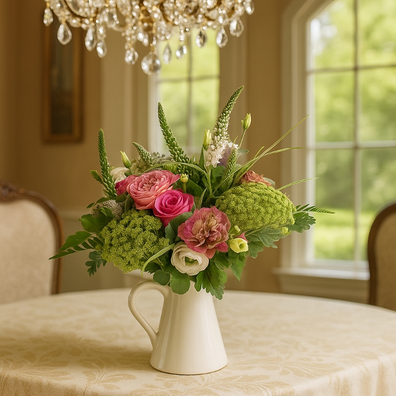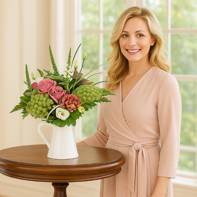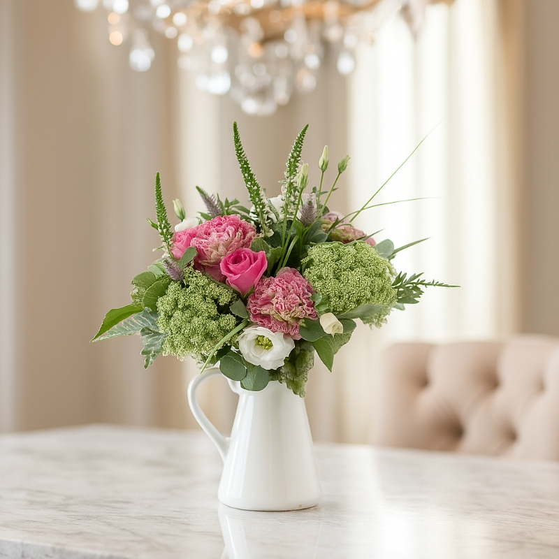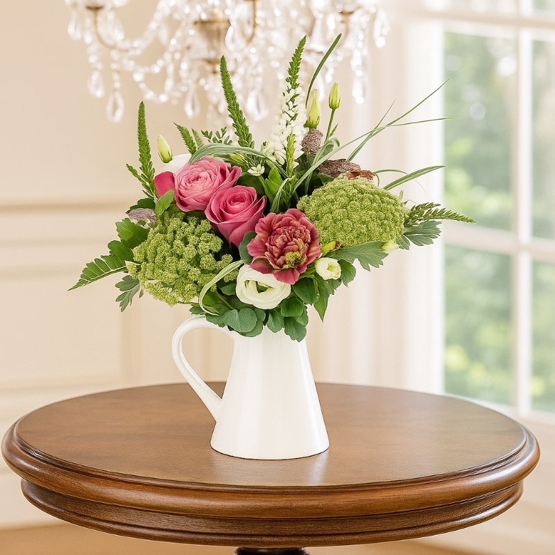 Meet Sarah—a delightful blend of garden-style flowers arranged with care and displayed in a rustic jug that enhances its natural charm.