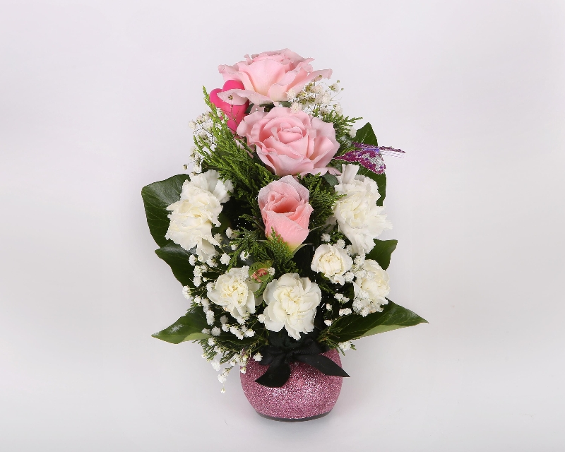 This is an interesting design - a pink glitter shoe filled with artificial flowers. The shoe arrangement is suitable for the celebration of the birth of a baby girl or for a special occasion such as a wedding or birthday. Presented in a ceramic pink glitter high heel shoe vase and filled with a pretty mix of large headed pastel pink and white roses, white spray carnations and finished off with a sprinkling of gypsophila and lush green leaves. The lovely silk textured petals look so true to life this arrangment is sure to make a spectacular impression.