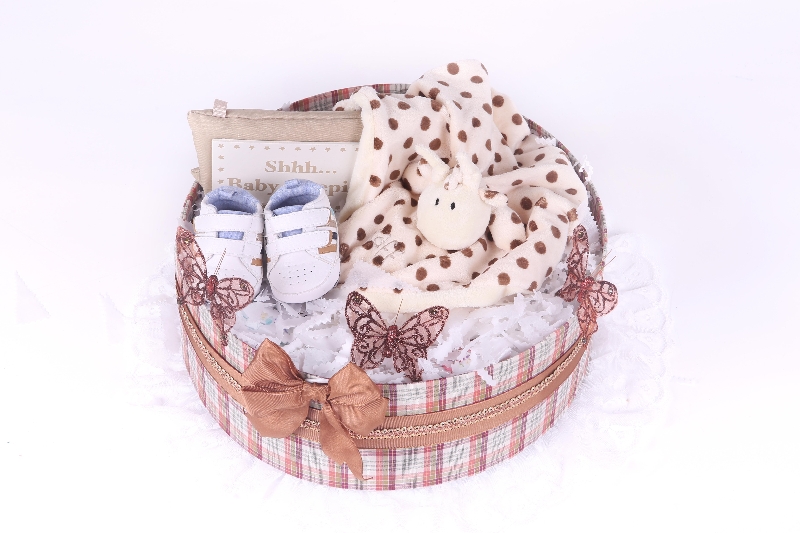 This is a large one tier chocolate brown baby boy nappy cake. This special nappy cake is filled with lovely useful and practical baby items. This unique Baby Nappy Cake is the perfect for a new baby boy. The gorgeous cake is complemented with satin bows and sparkly butterfly decorations and then hand-wrapped in cellophane with lots of pretty ribbons and bow. Everyone will love its trendy colours and design.