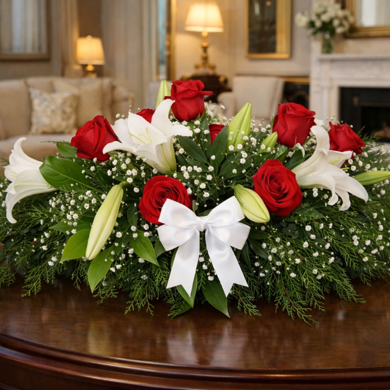 This traditionally arranged Red and White Casket Spray is a heartfelt expression of your deepest sympathies during times of grief. Featuring a luxurious array of fresh flowers, this stunning spray is adorned with large-headed red roses, pristine white lilies, and delicate blooms, all beautifully accented by gypsophilas and set against deep green, contrasting foliage. This evocative arrangement provides a poignant and elegant tribute to your loved one.