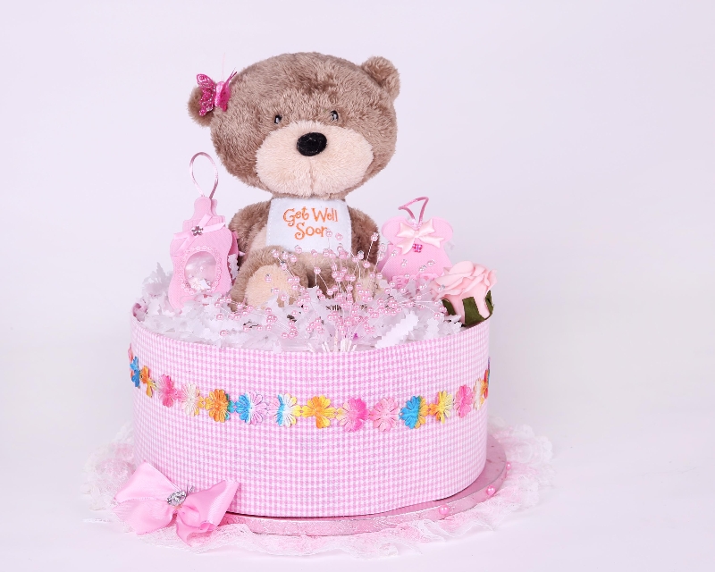 Stunning Handmade Get Well Soon Baby Girl Nappy Cake. The nappy cake is beautifully wrapped in cellophane and is topped with white paper shred and beautifully complemented with light pink felt flowers, accompanying these is cute teddy bear. This incredibly adorable gift will help to bring them some joy while they are recovery.