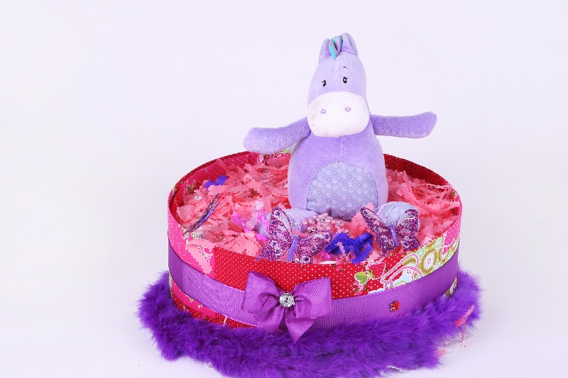 This special nappy cake is unique, fun and sure to impress. This one tier cake is hand made from layers of disposable nappies and wrapped in beautiful strawberry pink design fabrics to form into the shape of a cake. The nappy cake is beautifully wrapped in cellophane and is topped with hot pink paper shred and beautifully complemented with an Adorable purple hippo will sit as your topper.