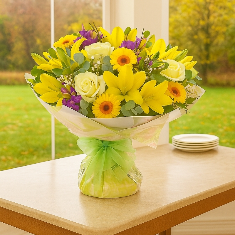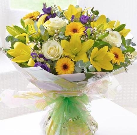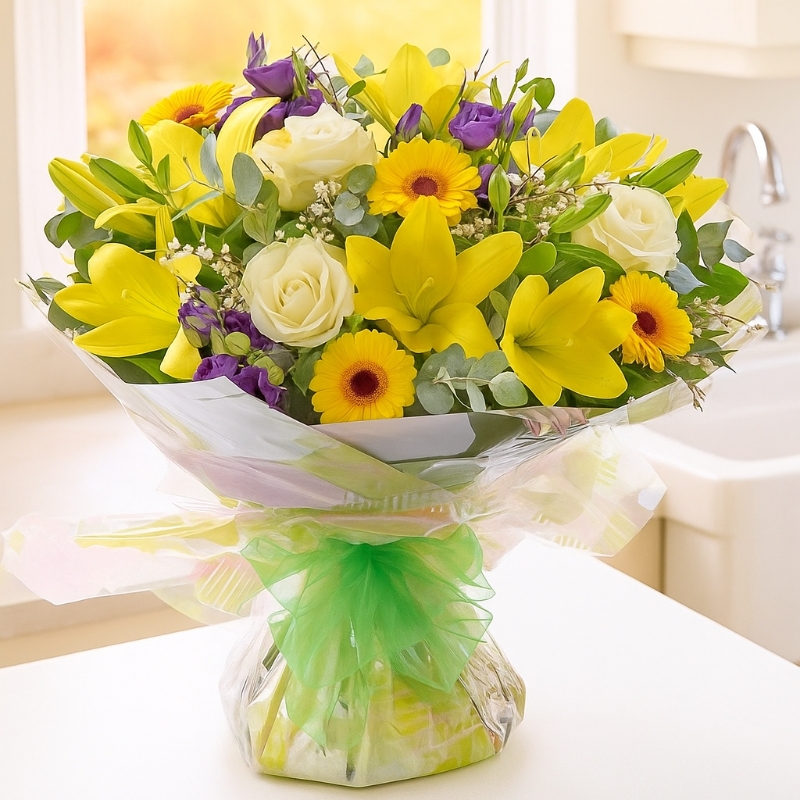 A vibrant celebration featuring beautiful lily la orange flowers, blue Statice, germinis, carnations, and chrysanthemums. Bright and beautiful, this bouquet has the power to lift anyone's mood and light up a whole room!