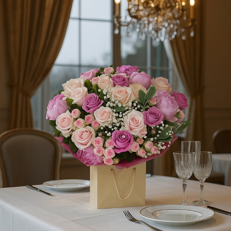 The mix of soft creams, gentle blush tones, and rich pinks creates a perfectly balanced palette suited for birthdays, anniversaries, new baby, thank-you gestures, congratulations, or simply surprising someone “just because.” Beautifully wrapped in decorative pink cellophane and presented in a stylish gift bag, the Day Bouquet is both graceful and impressive.