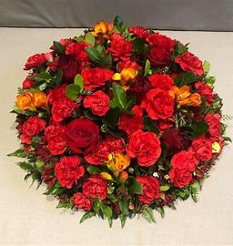 This beautiful posy pad features a delightful mix of red roses and gerberas, creating a bright and fragrant tribute for a loved one. The vibrant colors and lovely scents make it a perfect expression of your sympathy and affection. Additionally, this arrangement can be customized in any colors of your choice, including this stunning red posy pad, to suit your preferences and honor the memory of your loved one in a personal and meaningful way.