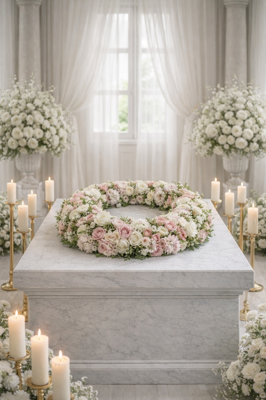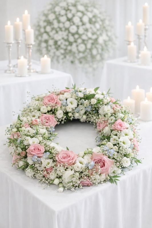 This 18-inch luxury wreath is handcrafted using a delicate blend of premium pink and white roses, chrysanthemums, and seasonal flowers, complemented by lush greenery for a full and graceful finish. Its gentle tones bring warmth and comfort during a difficult time, offering a truly heartfelt farewell.