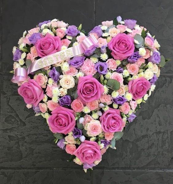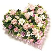 A heart tribute wreath in pink tones suitable for the passing of a lady. Unlike some other heart tributes on display, this rose heart is more sparse and offers the elegance of roses, Including a selection of fine roses, carnations, daisies and other seasonal flowers.