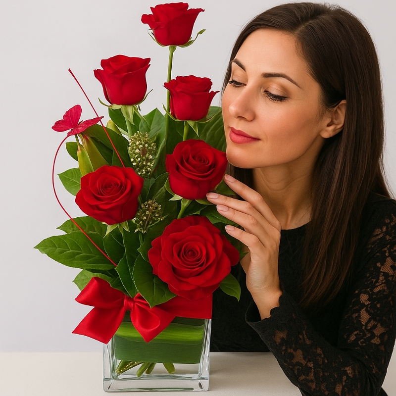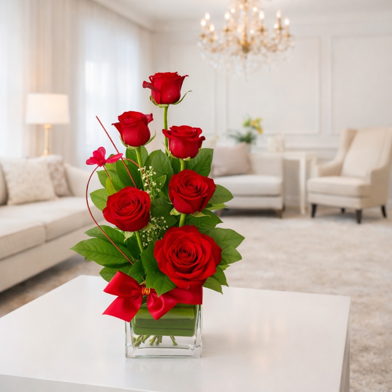 "Passionate Rose Bliss" is more than just a bouquet; it's a celebration of the timeless allure of roses. Nestled in a chic glass cube vase, adorned with a radiant red ribbon, these blossoms redefine tradition, symbolizing profound and passionate love. With 'Passionate Rose Bliss,' we send you boundless affection, in this exquisite arrangement.