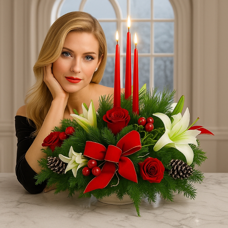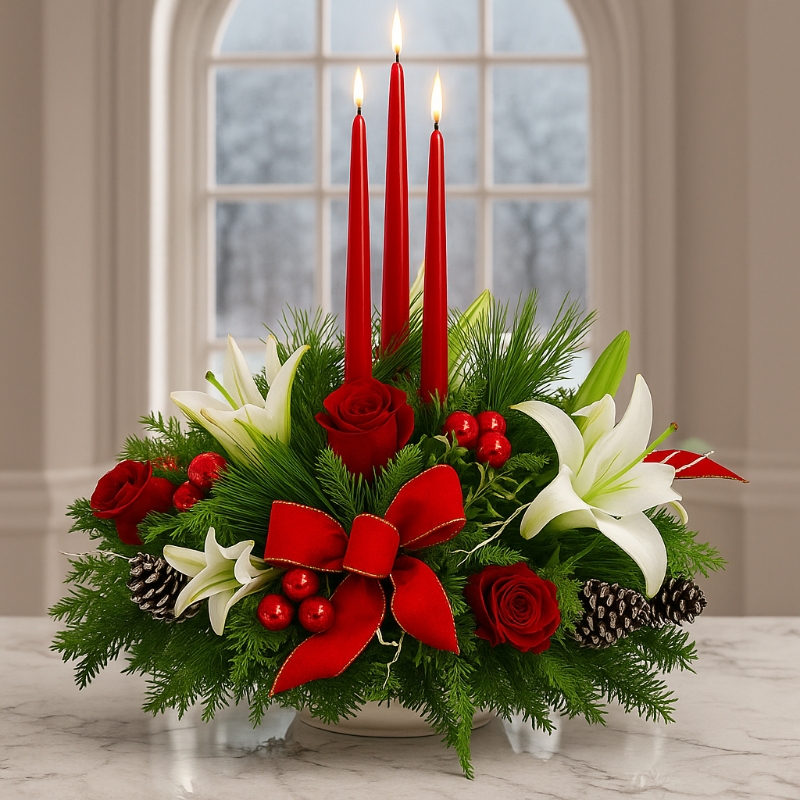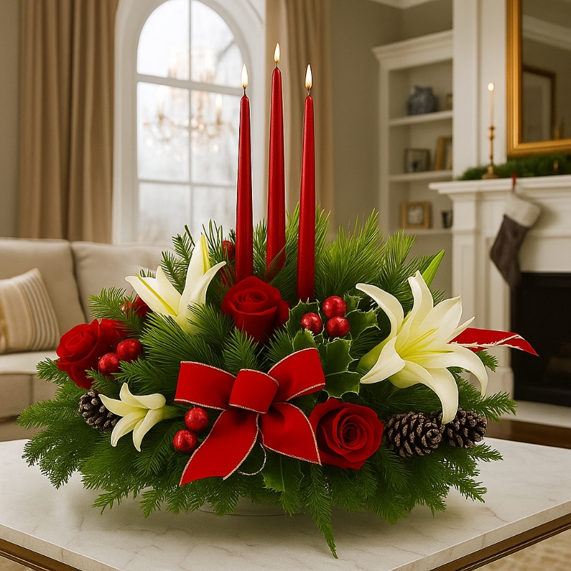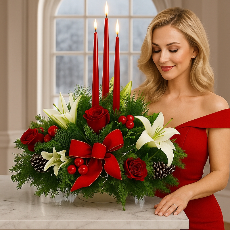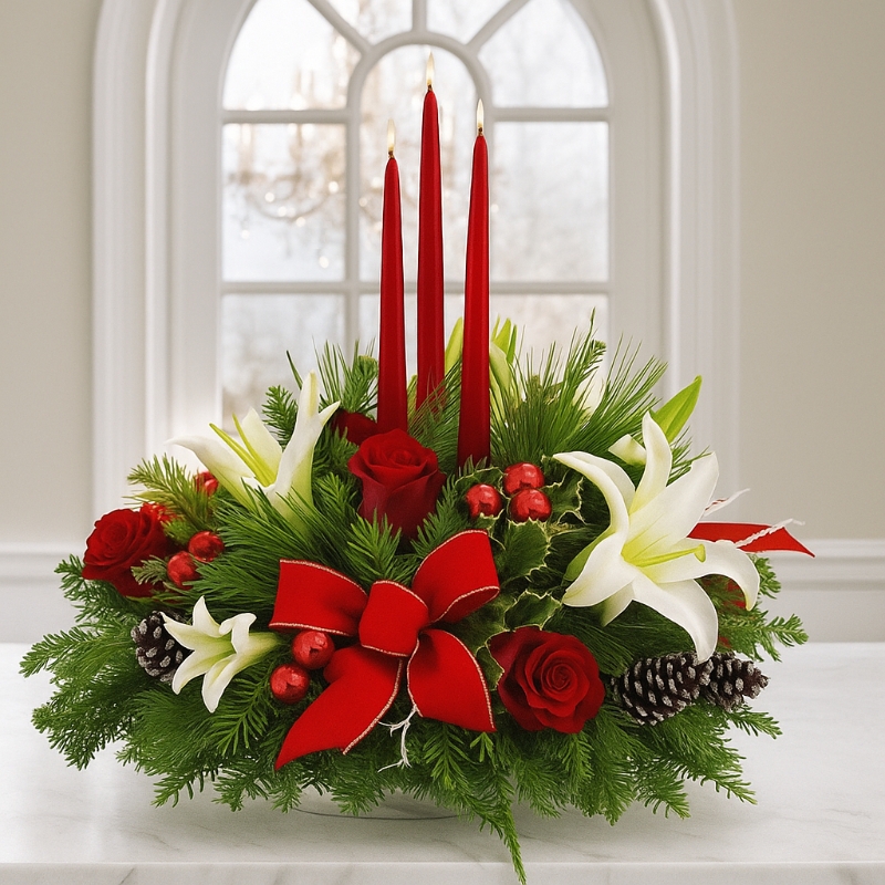 Perfect for displaying in the centre of the Christmas dinner table with a lovely pillar candle inside for all of the family to enjoy whilst eating their fantastic Christmas dinner, this roseberry centrepiece combines both the traditional colours of Christmas with a contemporary roses and Lillies design.