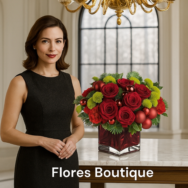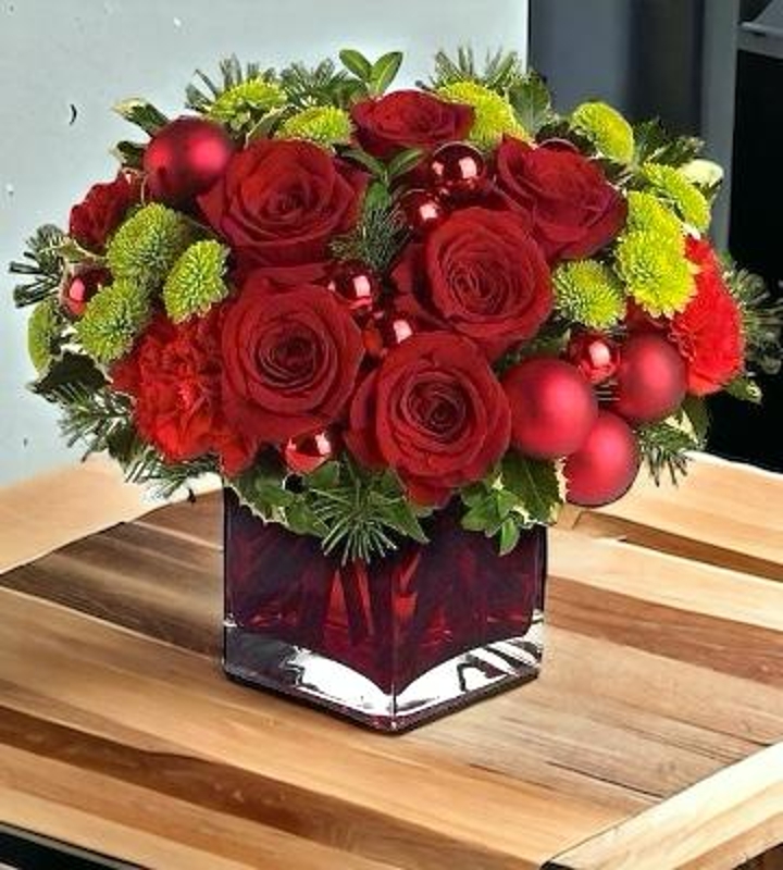"Introducing the Merry Velvet Affair: An enchanting arrangement that encapsulates the holiday spirit through the rich allure of velvety red roses, each blossom radiating timeless charm and joy. Paired harmoniously with verdant fresh green foliage, this display dazzles within a glass vase, weaving together a tale of festive merriment and natural elegance."