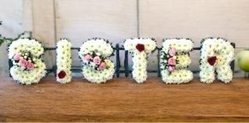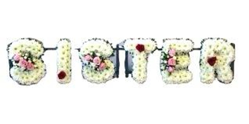 This elegant "Sister" funeral tribute is crafted with pure white chrysanthemums, delicately edged in laced ribbon, and accented with beautiful pink and white rose sprays. The sprays and ribbon can be customized to your preferred color scheme, ensuring a personal touch.