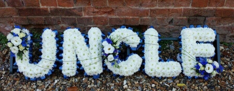 This "Uncle" funeral tribute is a heartfelt and intimate expression of love and remembrance. A mass of white spray chrysanthemums forms the base, beautifully accented with white roses and delicate foliage on each letter. The tribute is designed with personal significance in mind, making it a poignant and meaningful way to honor your loved one.