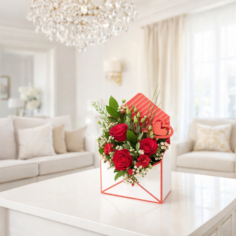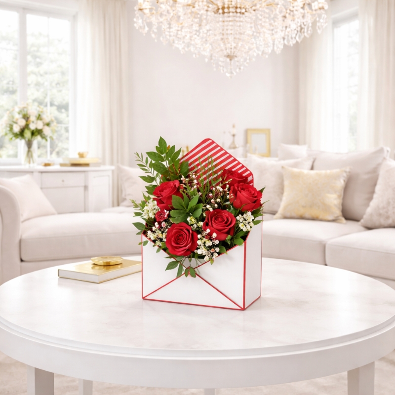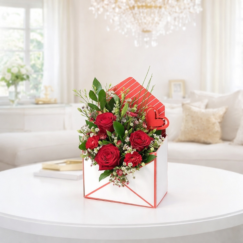 Say “I love you” in the most romantic way with this charming Love Letter Roses arrangement—designed exclusively for Valentine’s Day. Featuring premium red roses, accented with delicate fillers and lush greenery, this beautiful design is presented in a stylish envelope-inspired box, symbolizing a heartfelt love letter straight from the heart.