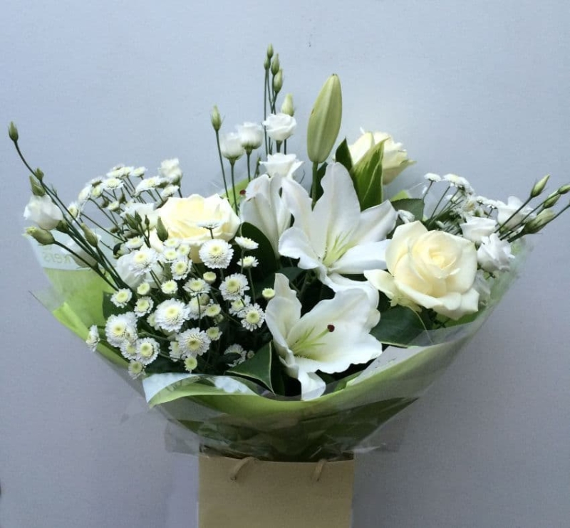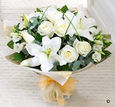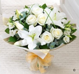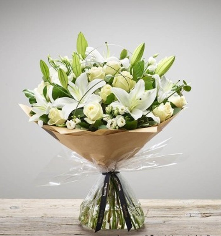 Express your heartfelt condolences with this elegant hand-tied bouquet, featuring white oriental lilies and lush foliage. A timeless and sophisticated tribute, perfect for sending in remembrance, each arrangement is elegantly presented without the need for a vase.