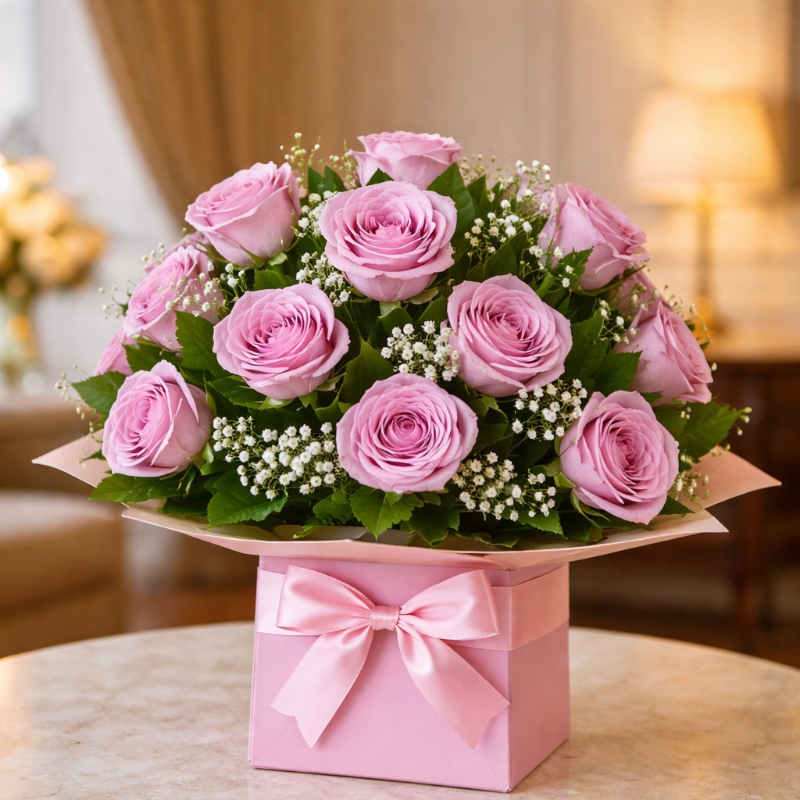 Softly accented with delicate romantic fillers and presented in an elegant box arranged in water for lasting freshness, the Dreamy Dozen is a ready-to-display floral gift that adds grace and charm to any celebration.