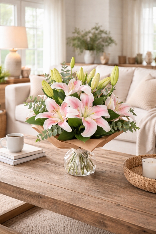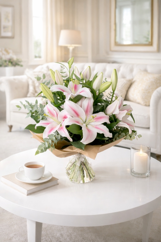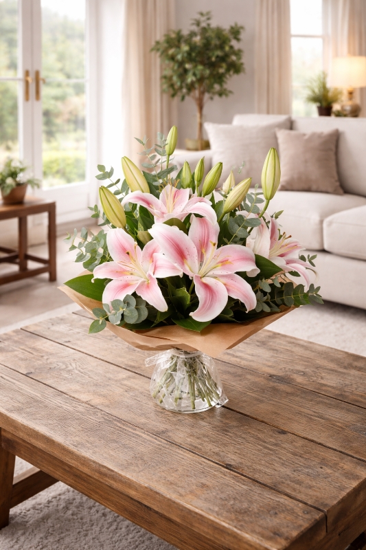 Accented with fresh greenery and wrapped in natural kraft paper for a refined presentation, the lilies bloom into magnificent star-shaped flowers that fill the room with beauty and a delicate, enchanting fragrance.