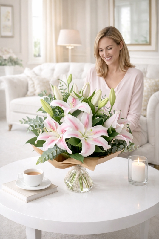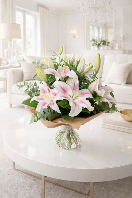 Elegant, fragrant, and breathtakingly beautiful, Star Gaze is a timeless bouquet designed to captivate and inspire. Featuring stunning pink oriental lilies with soft white edges and vibrant centers, this arrangement radiates sophistication and natural grace.