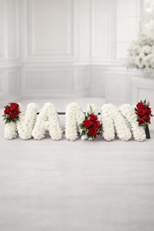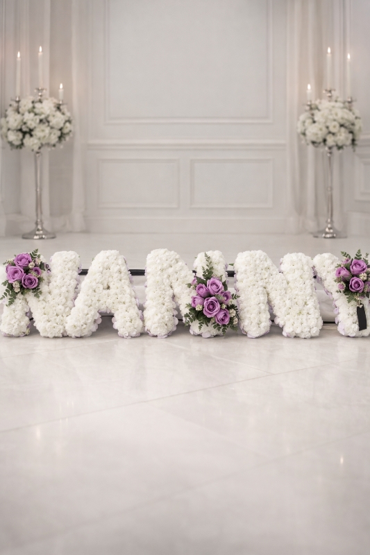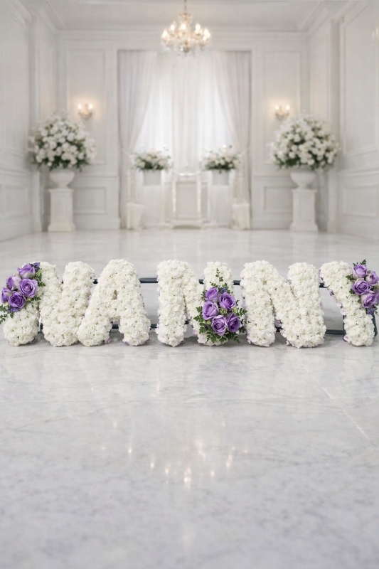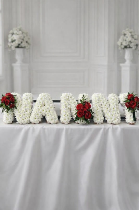 Each letter is carefully shaped on a professional oasis frame and delicately finished with pleated ribbon edging in your chosen colour. The design is enhanced with coordinating floral sprays, including roses and complementary seasonal blooms, adding depth, texture, and a graceful touch.