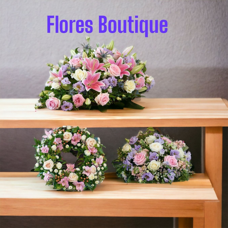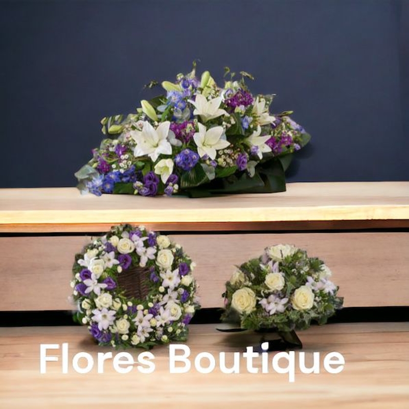 A collection of some of our most popular tributes - a casket spray, wreath and posy. Each features beautiful blooms in blue tones including roses, freesias and more.