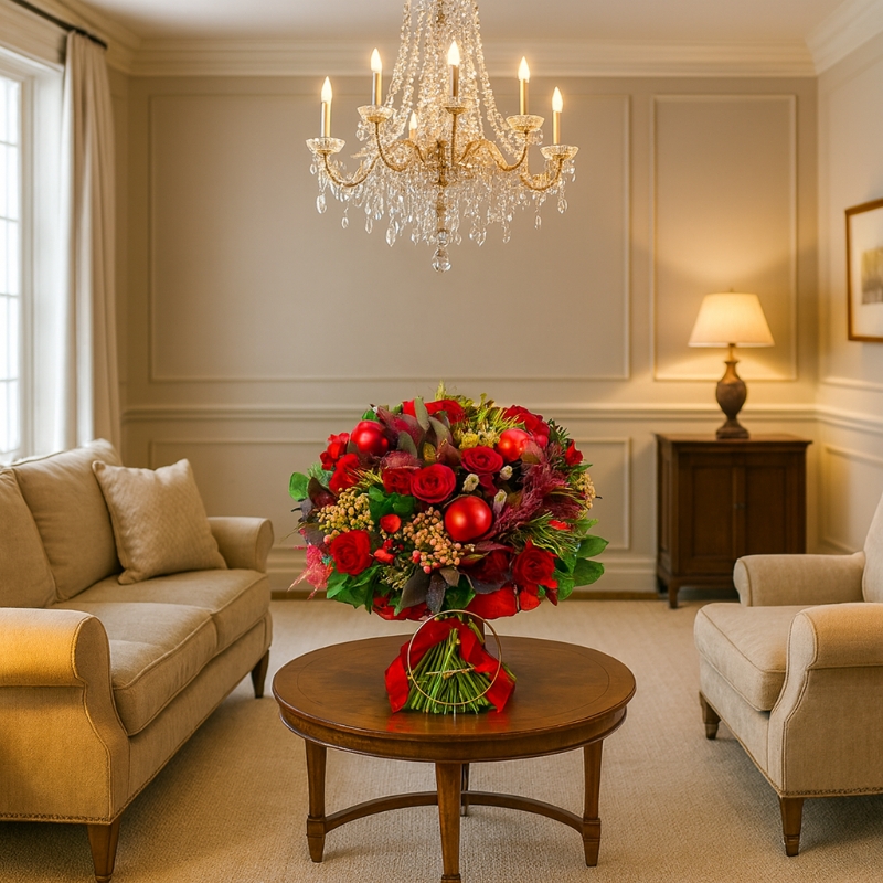 Wish them a very Happy Holiday season with our stunning red festive bouquet! This traditional bouquet is a beautiful celebration of the season.