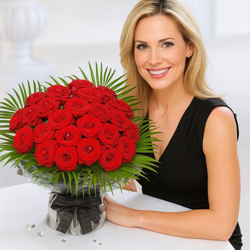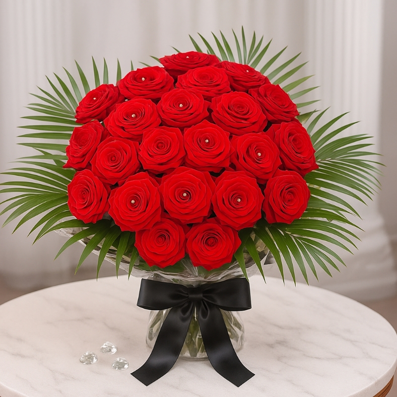 Say 'I love you' or 'Happy Birthday' with this magnificent display of 24 red Roses, adorned with a touch of Diamante sparkle. The ultimate romantic gesture or birthday surprise.