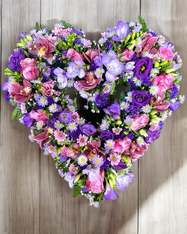 3. A 16 inch open heart tribute of mixed seasonal flowers