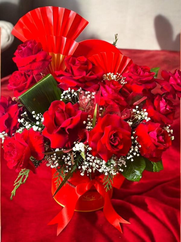 Nestled within a chic red hat box, the premium red roses are beautifully arranged alongside lush green foliage, creating a striking contrast that enhances the natural beauty of the flowers. Whether celebrating love, admiration, or a significant moment, the elegant presentation of this luxurious hat box exudes refinement and charm, making it an unforgettable gift.