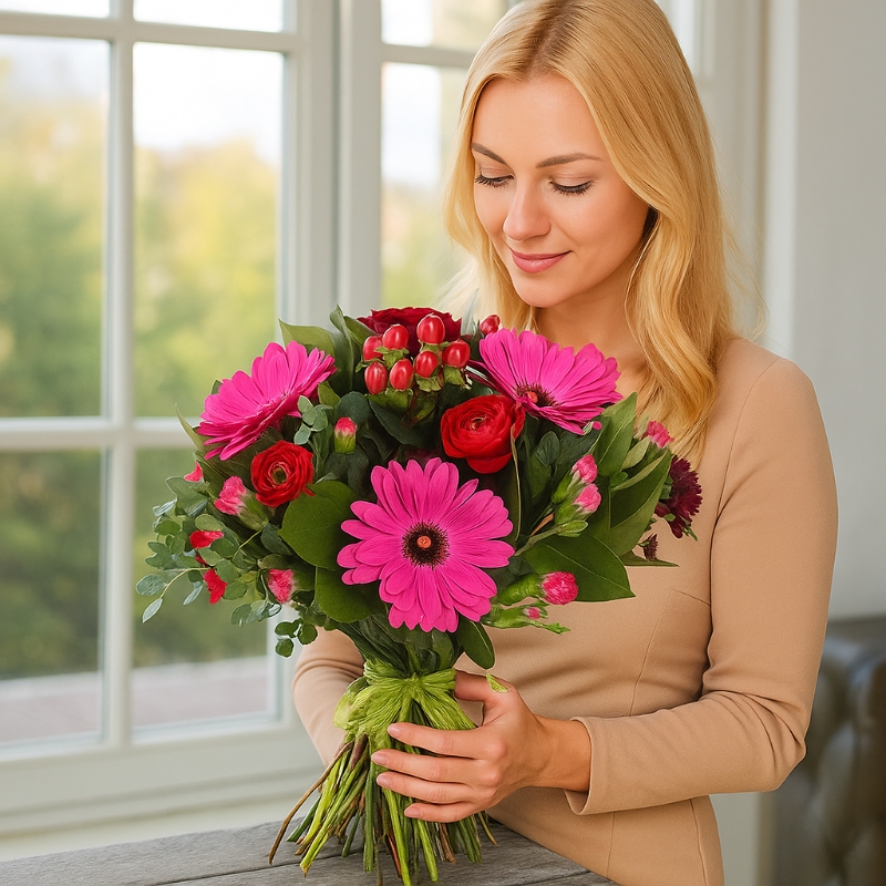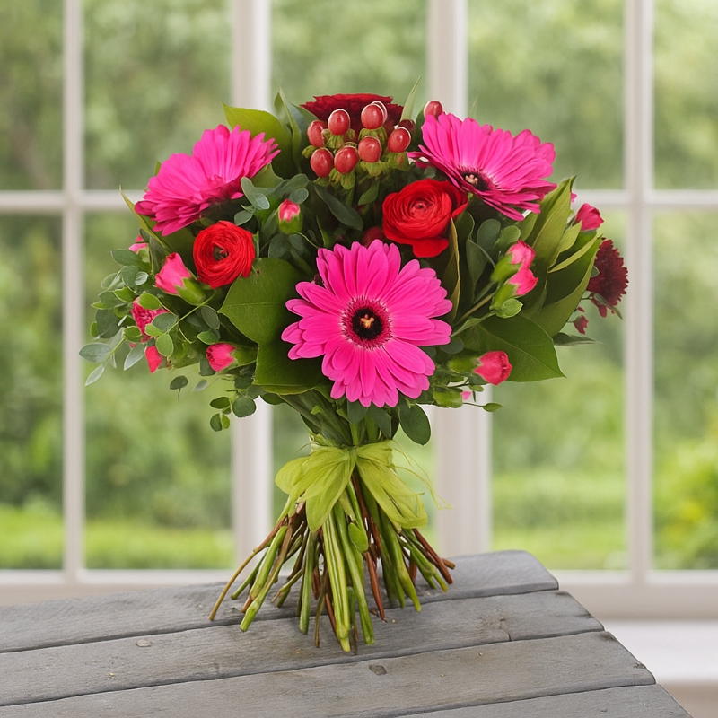 Hand-tied with fresh greenery and finished with a soft ribbon, this arrangement brings a lively, garden-fresh feel that’s full of warmth and love. The radiant pink tones symbolize admiration, gratitude, and appreciation — making it the perfect gift for Mother’s Day.