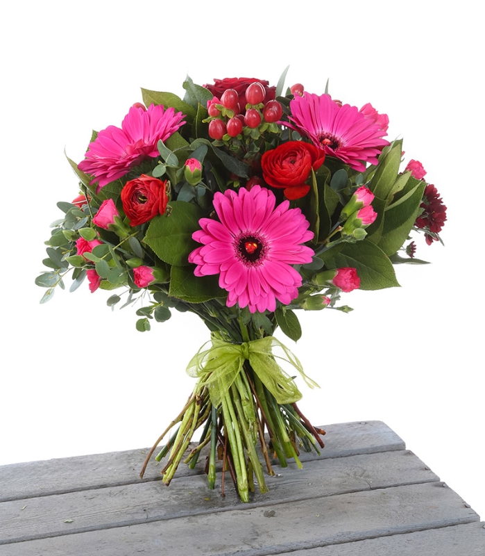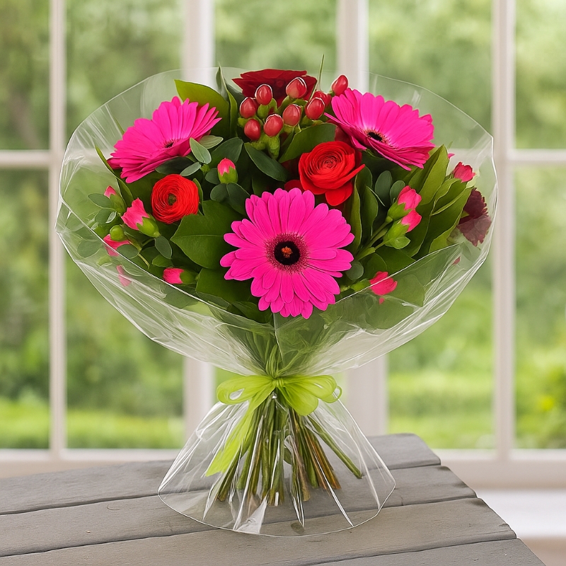 Celebrate Mom with bold beauty and joyful color. Pretty in Pink – Mother’s Day Edition is a vibrant bouquet featuring striking pink gerbera daisies, romantic red roses, delicate pink spray roses, and charming decorative berries.