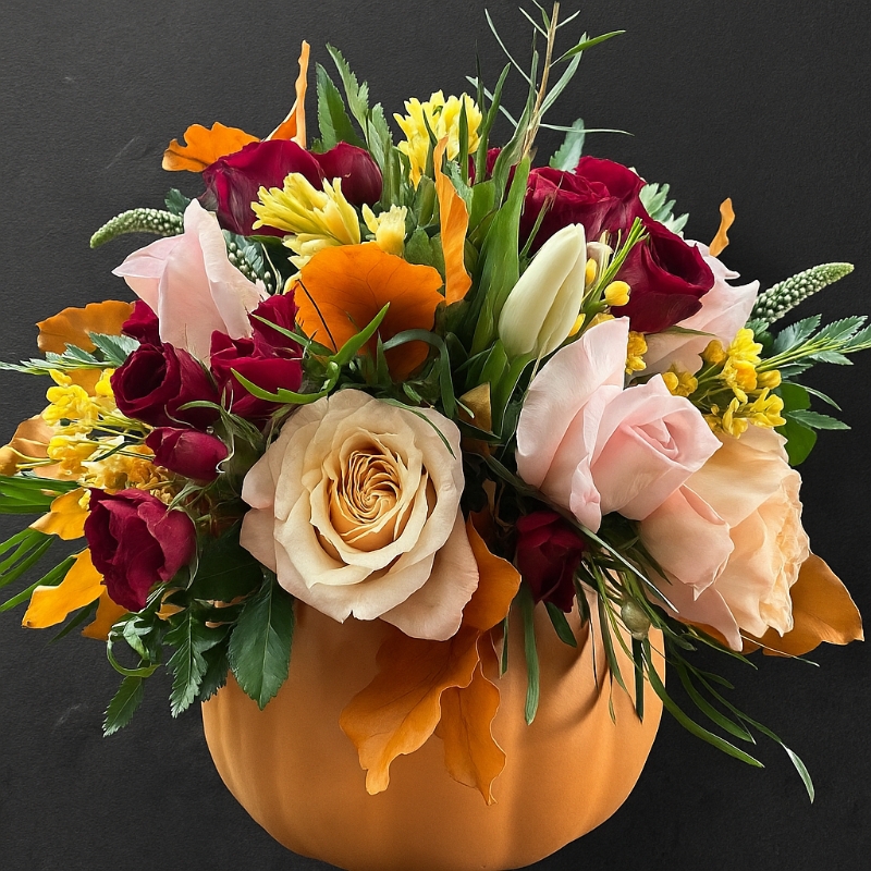 Bring the beauty of autumn indoors with our Fresh Fall Pumpkin arrangement. This festive ceramic pumpkin is filled with an abundance of fresh, seasonal flowers in warm fall tones—perfect for celebrating the harvest season. Each pumpkin is carefully designed with unique blooms, making every piece one-of-a-kind.