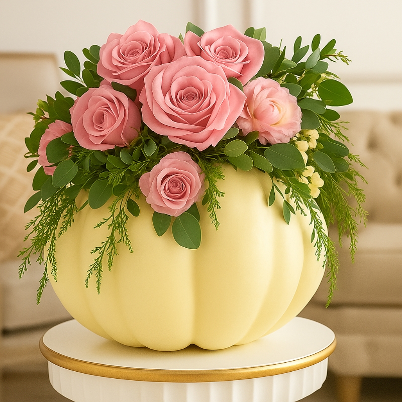 Soft, elegant, and full of charm, our Blush Pumpkin Bouquet is the perfect blend of seasonal style and timeless beauty. A creamy white pumpkin serves as a chic vessel, overflowing with lush greenery and delicate pink roses. This stunning arrangement brings a fresh, modern twist to traditional fall décor.