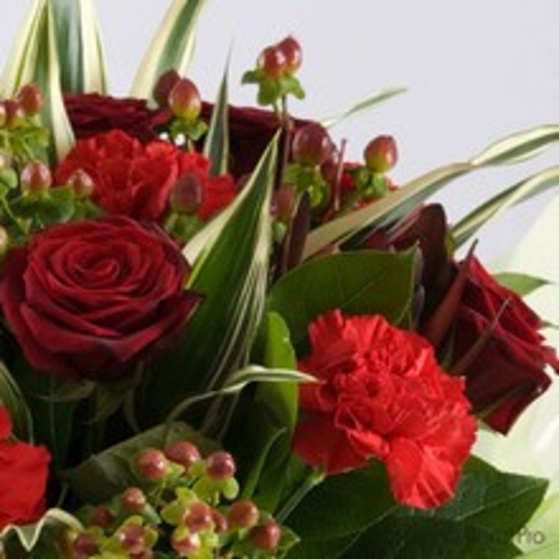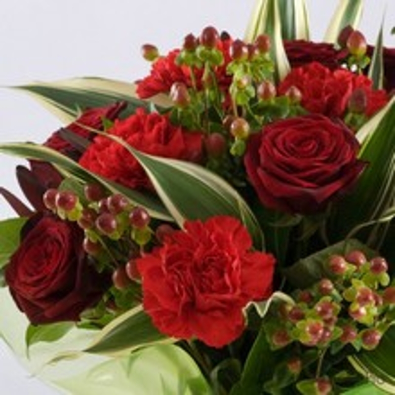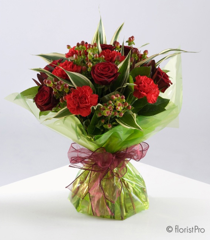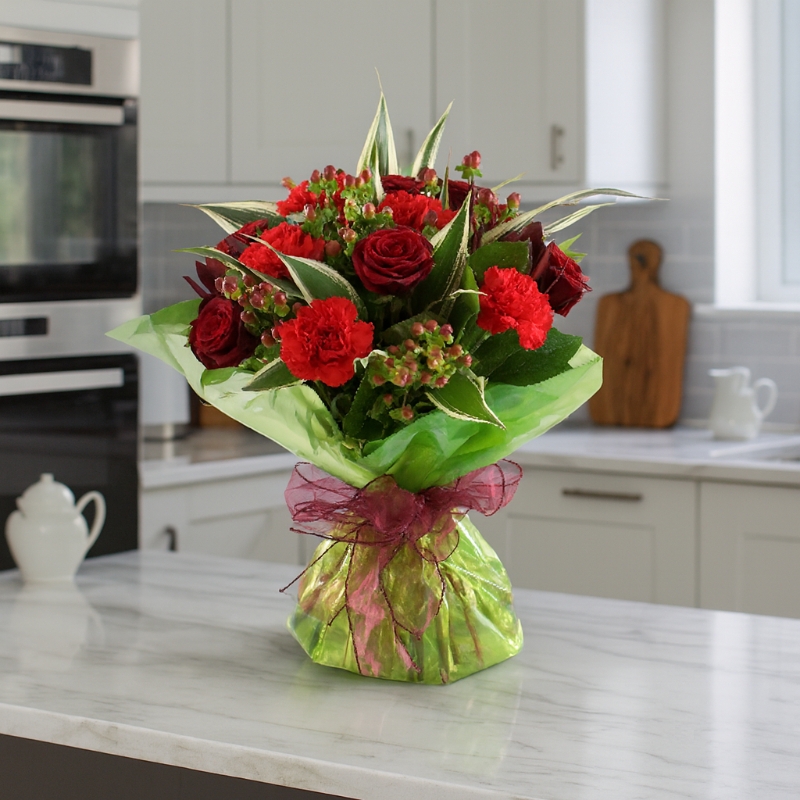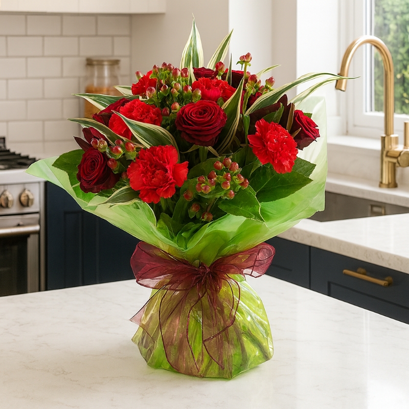 Introducing Aimee, a stunning hand-tied bouquet that combines the bold allure of red carnations with the vibrant charm of alstroemeria (also known as astromelia), creating a striking yet graceful display. This exquisite arrangement is accented with lush greenery, making it the perfect expression of admiration, love, and appreciation.