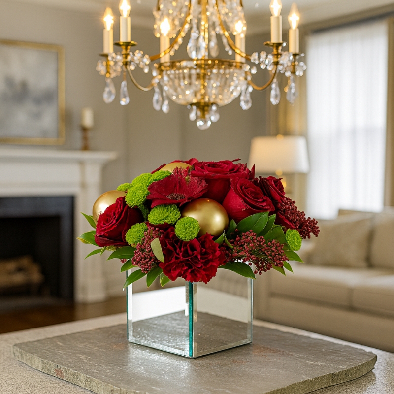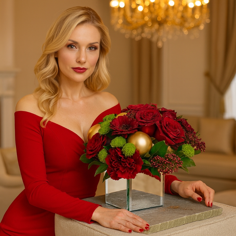 Surrounded by hand-selected Christmas decorations — soft metallic accents, festive baubles, and hints of winter sparkle — the arrangement becomes a celebration of the season itself. Every element works in harmony to evoke warmth, beauty, and the magic only Christmas can bring.