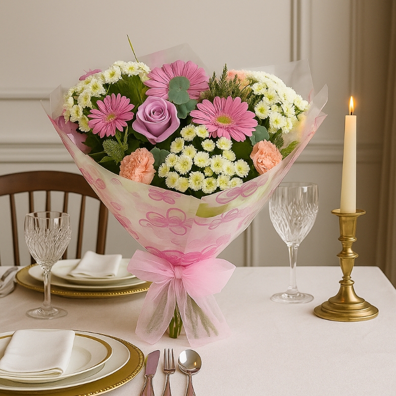 The soft pearly tones and pretty textures make this bouquet perfect for birthdays, thank-you gifts, get-well wishes, congratulations, or simply brightening someone’s day. Wrapped in decorative floral cellophane and finished with a delicate pink bow, it arrives looking graceful and truly heart-warming.