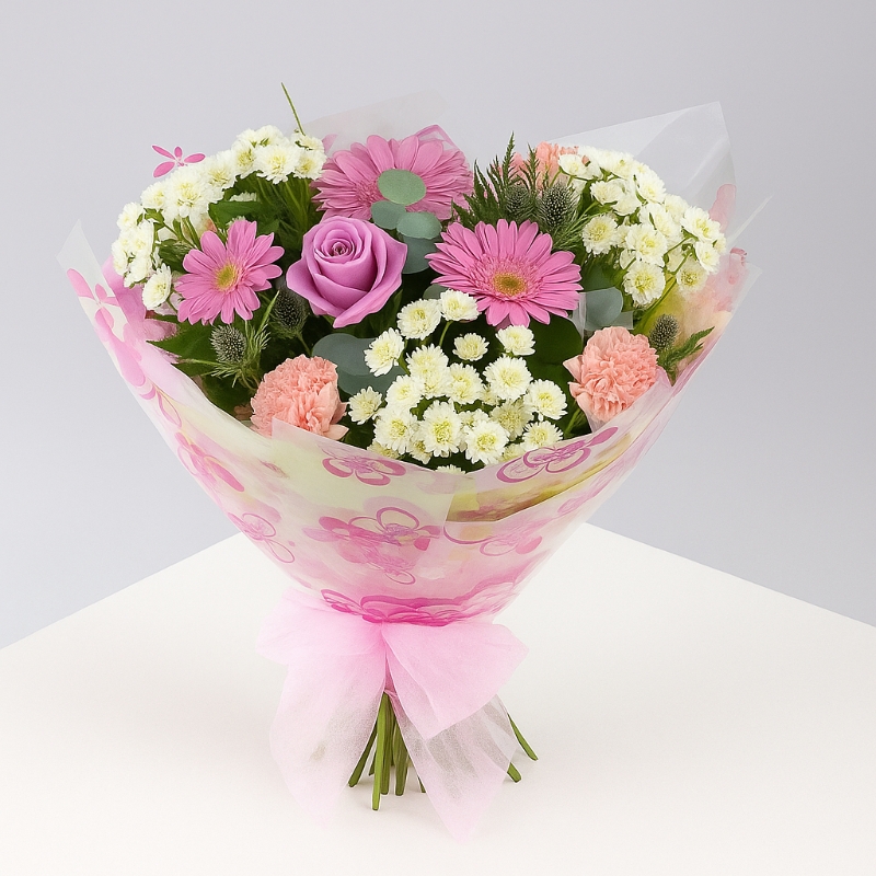 Soft, sweet, and beautifully uplifting, the Pearl Blossom Bouquet is a charming blend of delicate pink and white blooms designed to bring joy to any occasion. Featuring soft pink gerberas, classic roses, dainty spray carnations, and fresh white chrysanthemums, every stem is thoughtfully arranged with lush greenery to create a bouquet full of gentle elegance and pastel beauty.
