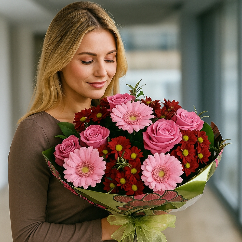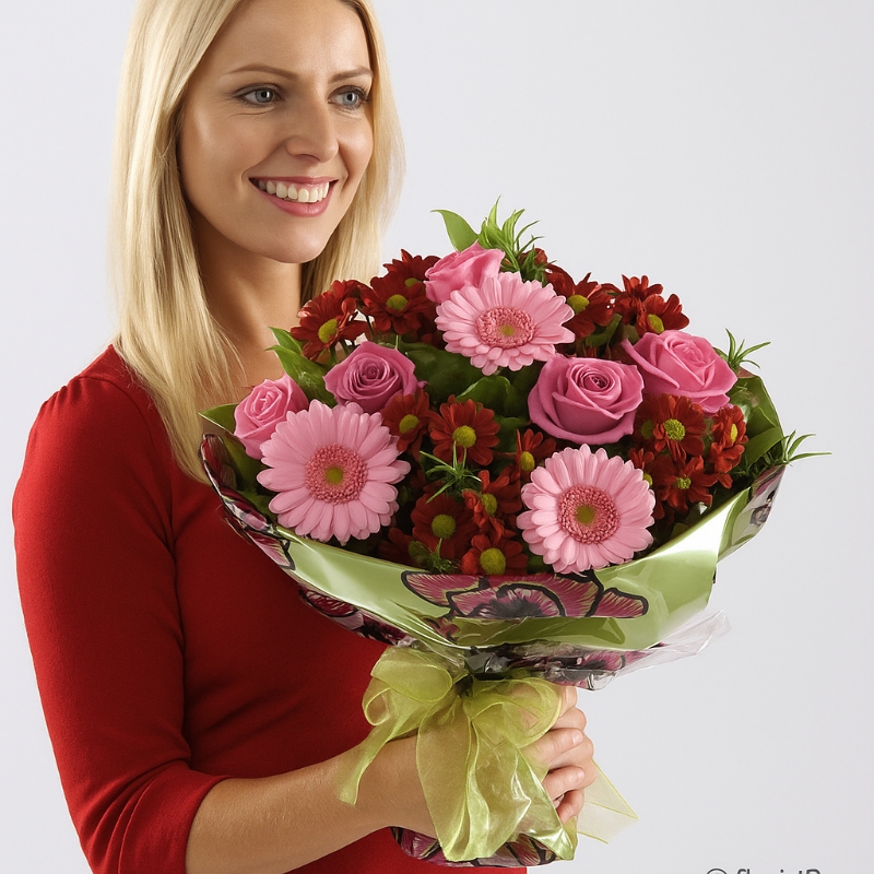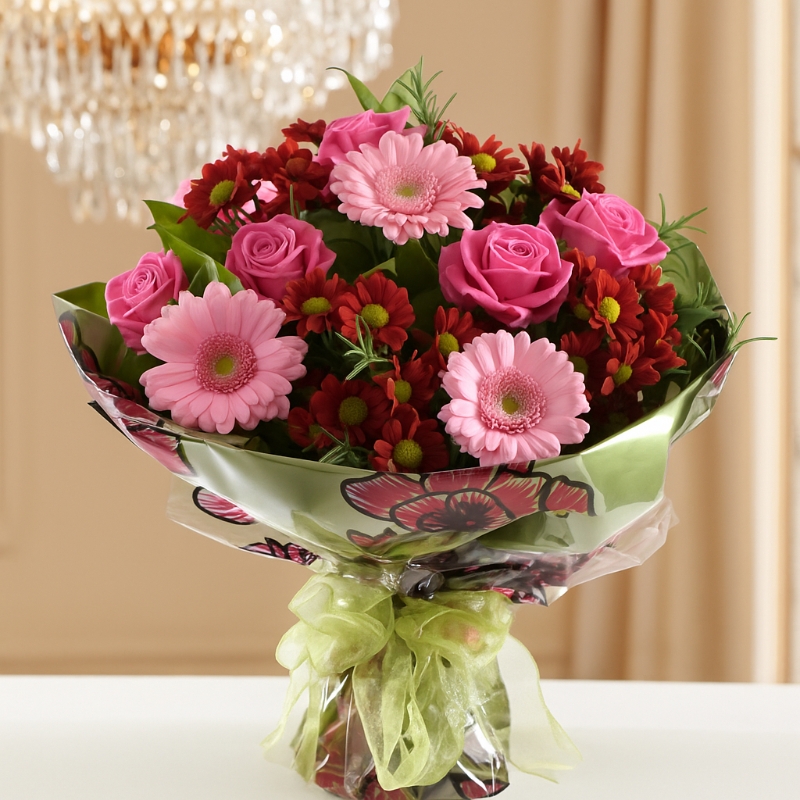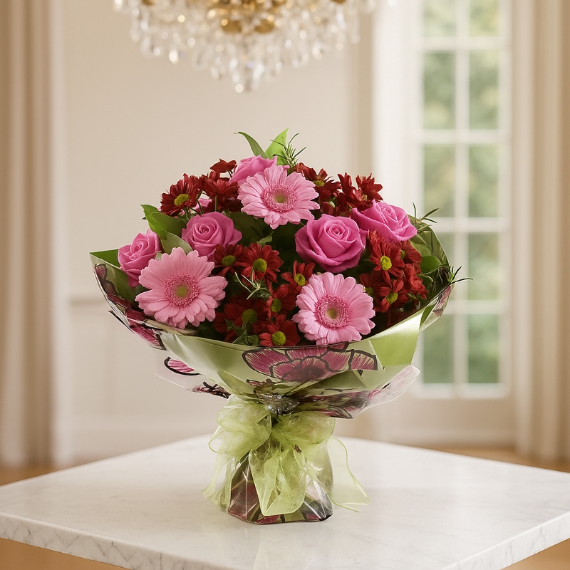Bright, charming, and full of joyful colour, the Alice Bouquet blends vibrant pink gerberas, rich raspberry-toned chrysanthemums, and elegant pink roses with fresh seasonal foliage. This eye-catching arrangement combines soft feminine tones with deeper, more dramatic shades, creating a beautifully balanced bouquet that feels lively yet elegant.