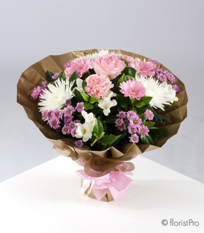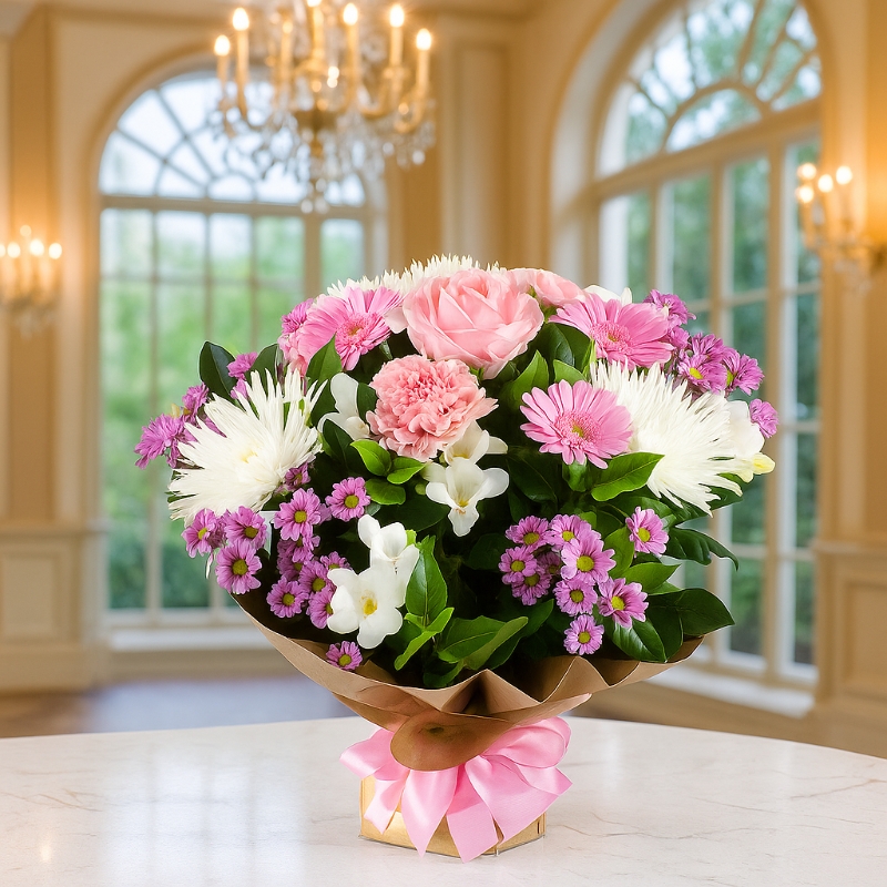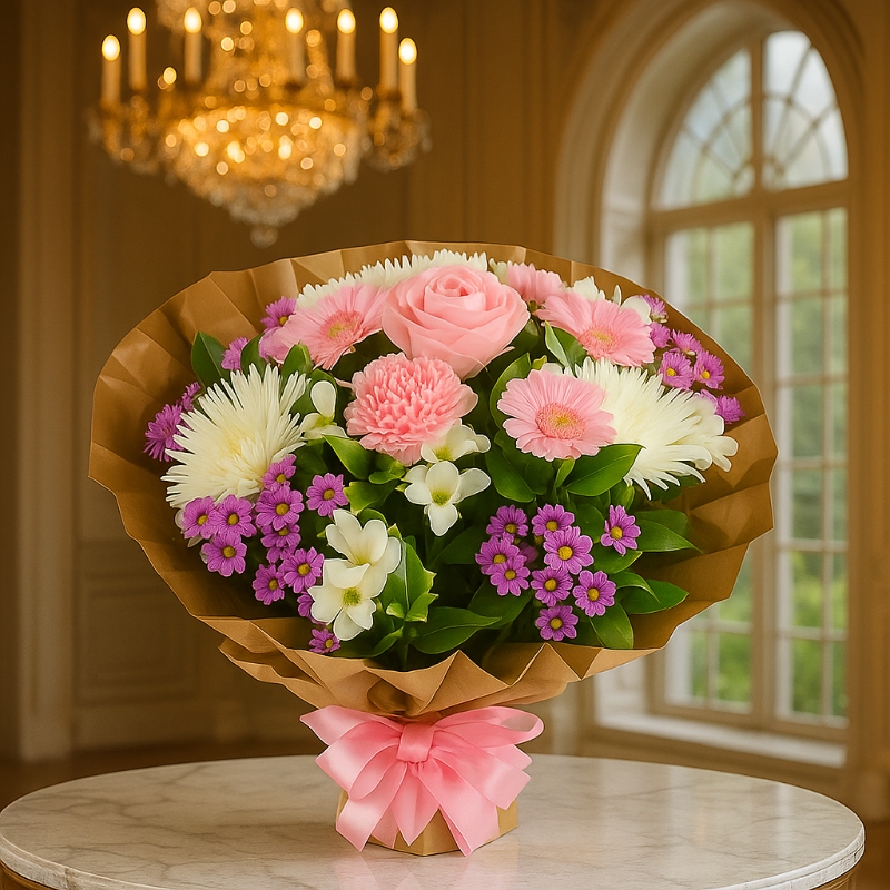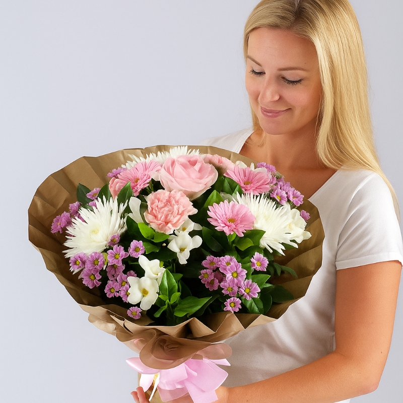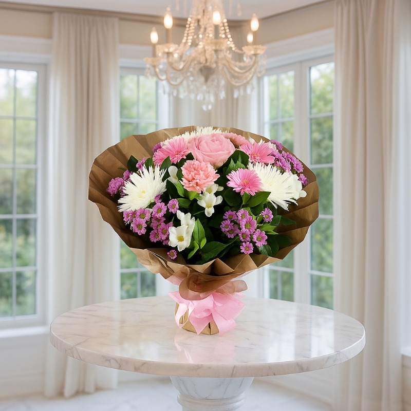 The soft pink and lilac shades bring a tender, romantic touch, while the crisp white flowers add balance and brightness. Lush greenery frames the arrangement, giving Ella a full, rounded, luxury finish. Wrapped in warm kraft-inspired paper and tied with a soft pink bow, the presentation feels both modern and gracefully classic—perfect for making someone feel truly special.