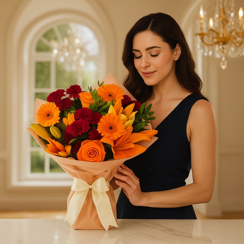 Bring warmth and festive elegance into any home with our Festive Glow Christmas Bouquet. Featuring vibrant orange gerberas, rich red blooms, golden roses, and seasonal greenery, this arrangement is beautifully hand-tied and finished with classic wrapping and a soft ribbon. Perfect for gifting or as a centrepiece, it adds a cosy, joyful touch to Christmas celebrations.