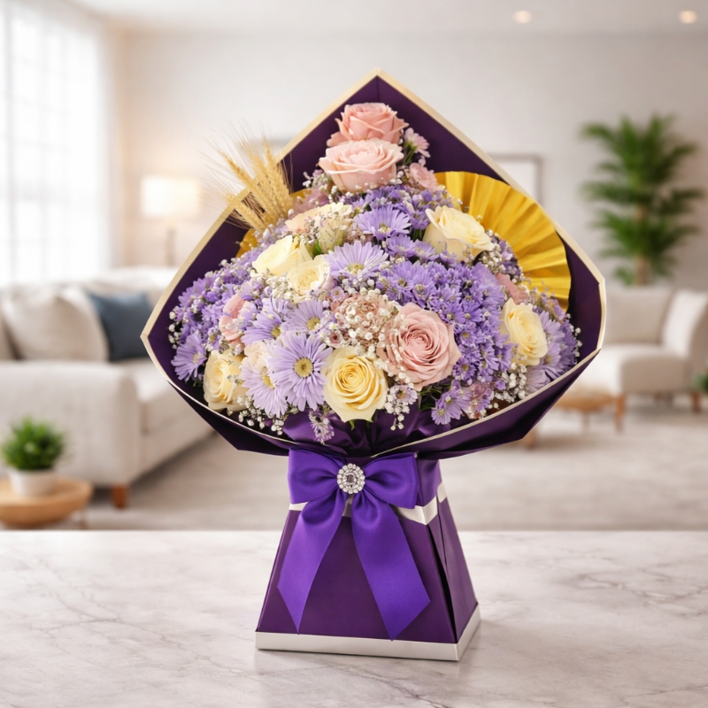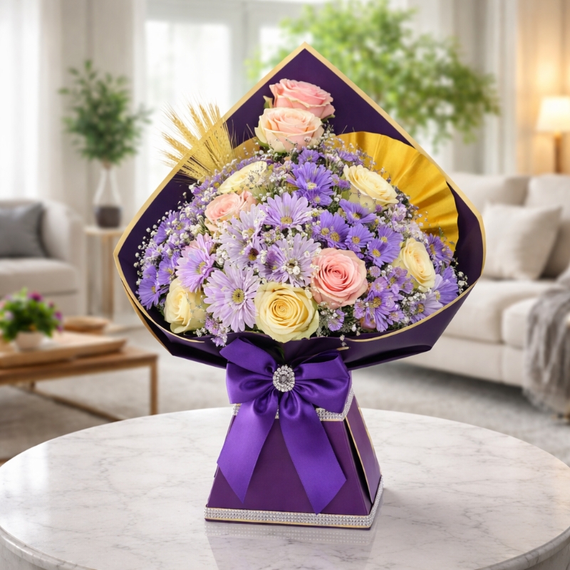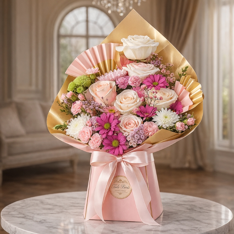 Expertly hand-tied and wrapped in luxurious pink and gold-toned paper, Pinky Radiance Delight is presented in water, making it ready to display with no vase required—perfect for effortless gifting. Every detail is thoughtfully curated to create a graceful and uplifting expression of love.