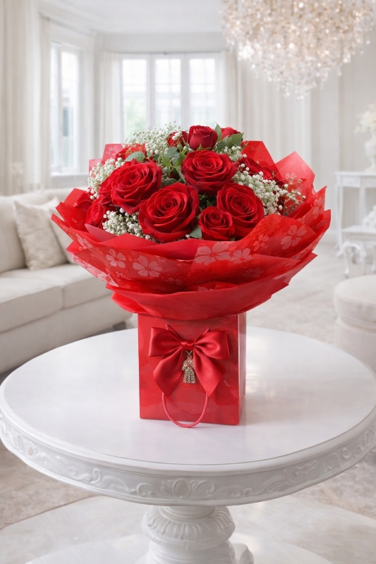 Make every romantic moment unforgettable with this breathtaking red rose bouquet, beautifully wrapped in luxurious red paper and finished with a delicate ribbon. Featuring vibrant, hand-selected red roses paired with soft white baby’s breath, this arrangement captures the perfect balance of passion and elegance.