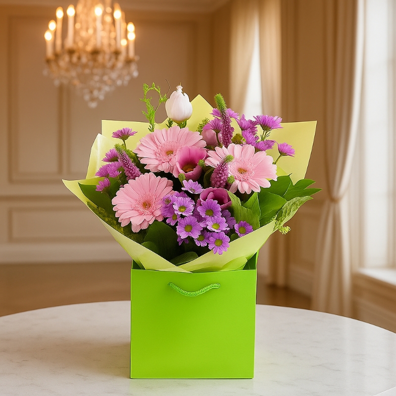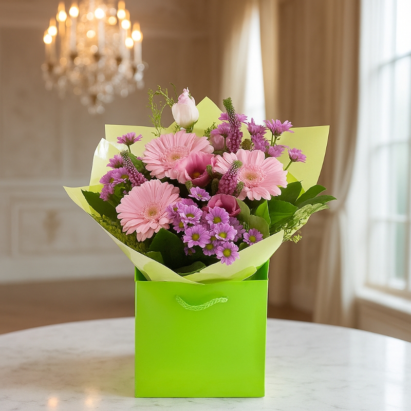 Presented in a striking lime green aqua gift bag with coordinating wrap, it arrives perfectly arranged and ready to display — no vase needed. Simply place and enjoy.