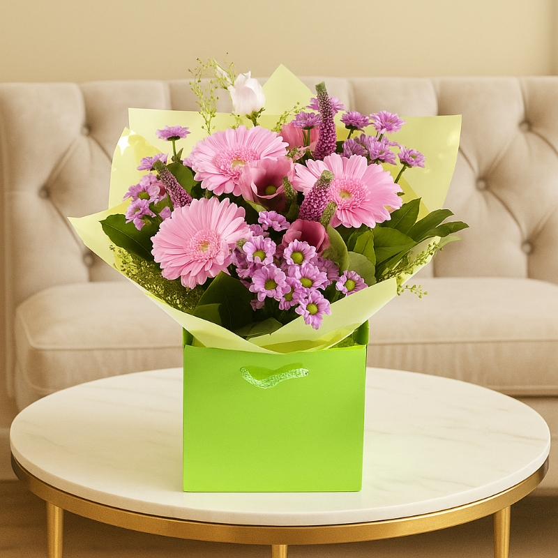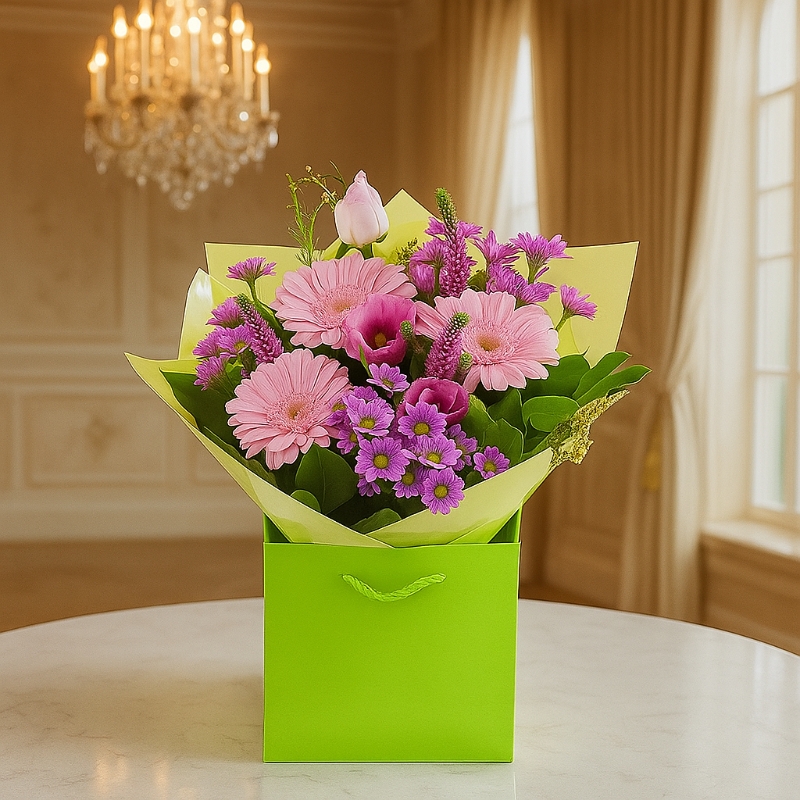 Bright, fresh, and full of charm, Lime Blush Bloom is a vibrant arrangement designed to instantly uplift any space. Featuring stunning pink gerberas, delicate lilac chrysanthemums, elegant seasonal blooms, and lush greenery, this bouquet beautifully blends soft blush tones with lively pops of colour.