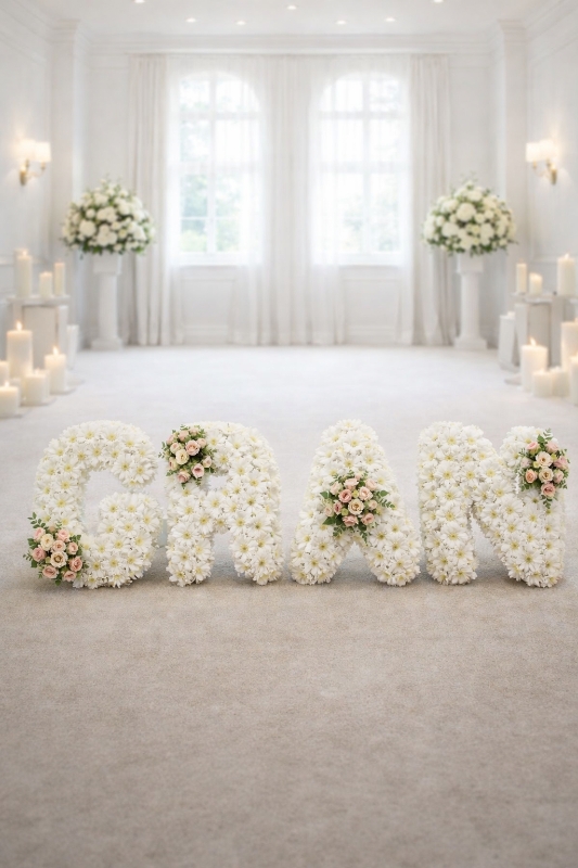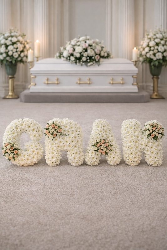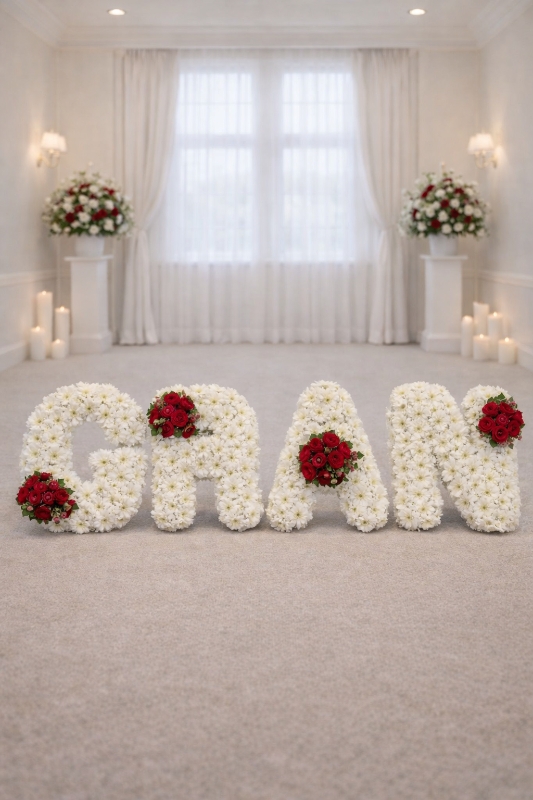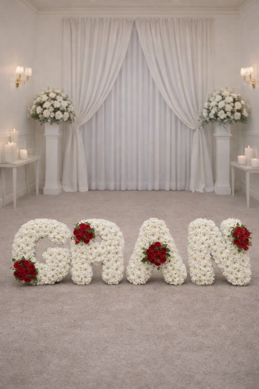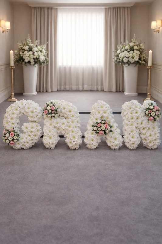 Each letter is carefully shaped on a professional oasis frame and finished with pleated ribbon edging in your chosen colour, creating a refined and graceful design. Coordinating floral sprays are added to enhance the tribute and give a balanced, elegant look.