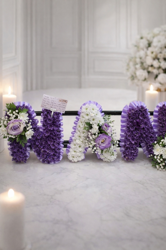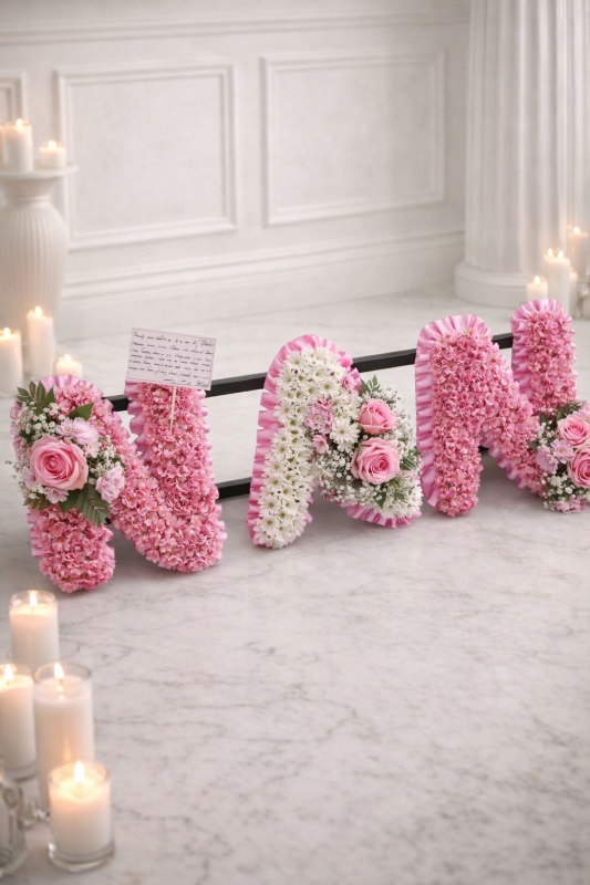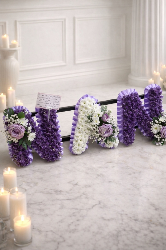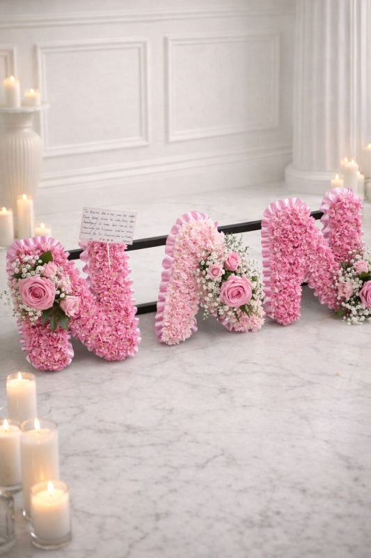 This elegant arrangement is created using the freshest premium white chrysanthemums, symbolising peace and everlasting love. Each letter is carefully shaped and finished with a ribbon edging in your chosen colour, complemented by delicate coordinating floral sprays to enhance its beauty.